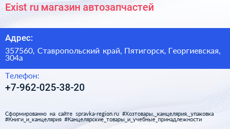 Exist.ru, магазин автозапчастей по адресу 357560, Ставропольский край, Пятигорск, Георгиевская, 304а в дальнейшем Организация, размещена в следующих категориях:
