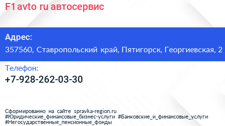 F1-avto.ru, автосервис по адресу 357560, Ставропольский край, Пятигорск, Георгиевская, 2 в дальнейшем Организация, размещена в следующих категориях: