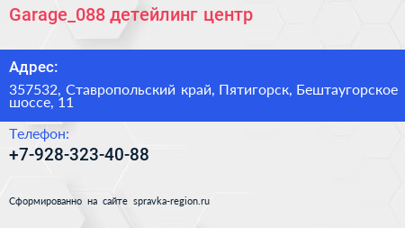 Garage_088, детейлинг-центр по адресу 357532, Ставропольский край, Пятигорск, Бештаугорское шоссе, 11 в дальнейшем Организация, размещена в следующих категориях: