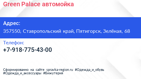 Green Palace, автомойка по адресу 357550, Ставропольский край, Пятигорск, Зелёная, 68 в дальнейшем Организация, размещена в следующих категориях: