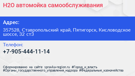 H2O, автомойка самообслуживания по адресу 357528, Ставропольский край, Пятигорск, Кисловодское шоссе, 32 ст3 в дальнейшем Организация, размещена в следующих категориях: