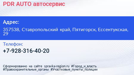 PDR-AUTO, автосервис по адресу 357538, Ставропольский край, Пятигорск, Ессентукская, 29 в дальнейшем Организация, размещена в следующих категориях: