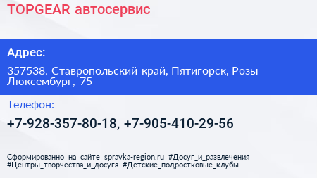 TOPGEAR, автосервис по адресу 357538, Ставропольский край, Пятигорск, Розы Люксембург, 75 в дальнейшем Организация, размещена в следующих категориях: