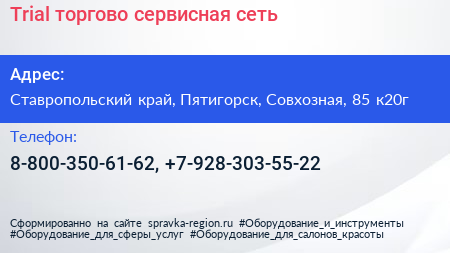 Trial, торгово-сервисная сеть по адресу Ставропольский край, Пятигорск, Совхозная, 85 к20г в дальнейшем Организация, размещена в следующих категориях: