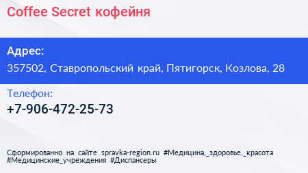 Coffee Secret, кофейня по адресу 357502, Ставропольский край, Пятигорск, Козлова, 28 в дальнейшем Организация, размещена в следующих категориях: