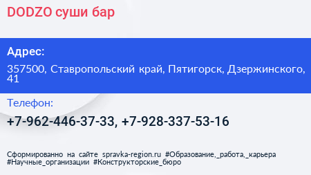 DODZO, суши-бар по адресу 357500, Ставропольский край, Пятигорск, Дзержинского, 41 в дальнейшем Организация, размещена в следующих категориях: