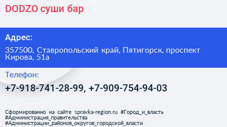 DODZO, суши-бар по адресу 357500, Ставропольский край, Пятигорск, проспект Кирова, 51а в дальнейшем Организация, размещена в следующих категориях: