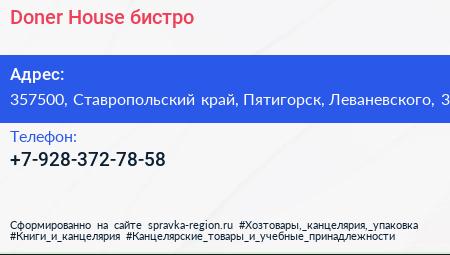 Doner House, бистро по адресу 357500, Ставропольский край, Пятигорск, Леваневского, 3 в дальнейшем Организация, размещена в следующих категориях:
