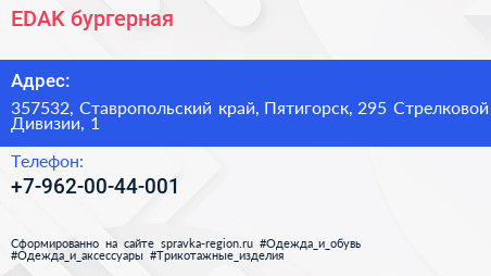 EDAK, бургерная по адресу 357532, Ставропольский край, Пятигорск, 295 Стрелковой Дивизии, 1 в дальнейшем Организация, размещена в следующих категориях: