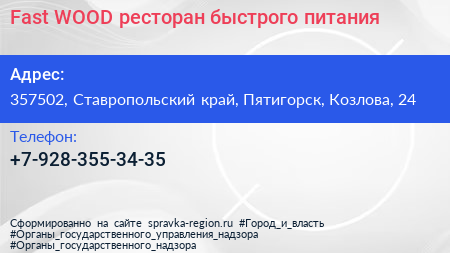 Fast WOOD, ресторан быстрого питания по адресу 357502, Ставропольский край, Пятигорск, Козлова, 24 в дальнейшем Организация, размещена в следующих категориях:
