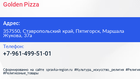 Golden Pizza по адресу 357550, Ставропольский край, Пятигорск, Маршала Жукова, 37а в дальнейшем Организация, размещена в следующих категориях: