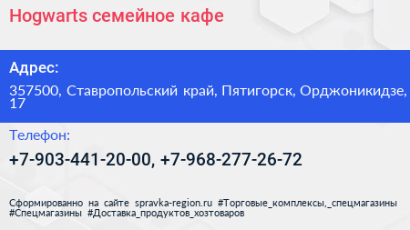 Hogwarts, семейное кафе по адресу 357500, Ставропольский край, Пятигорск, Орджоникидзе, 17 в дальнейшем Организация, размещена в следующих категориях:
