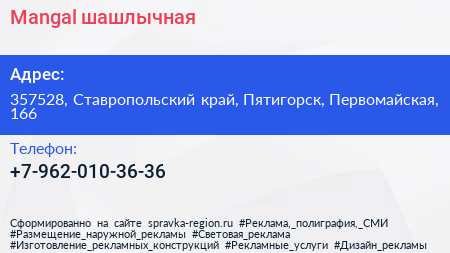 Mangal, шашлычная по адресу 357528, Ставропольский край, Пятигорск, Первомайская, 166 в дальнейшем Организация, размещена в следующих категориях: