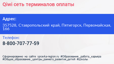 Qiwi, сеть терминалов оплаты по адресу 357528, Ставропольский край, Пятигорск, Первомайская, 166 в дальнейшем Организация, размещена в следующих категориях: