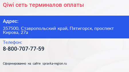 Qiwi, сеть терминалов оплаты по адресу 357500, Ставропольский край, Пятигорск, проспект Кирова, 27а в дальнейшем Организация, размещена в следующих категориях: