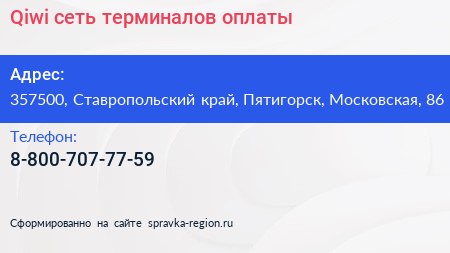 Qiwi, сеть терминалов оплаты по адресу 357500, Ставропольский край, Пятигорск, Московская, 86 в дальнейшем Организация, размещена в следующих категориях: