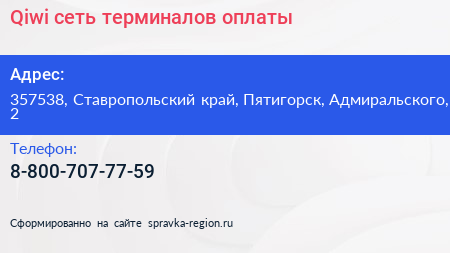 Qiwi, сеть терминалов оплаты по адресу 357538, Ставропольский край, Пятигорск, Адмиральского, 2 в дальнейшем Организация, размещена в следующих категориях: