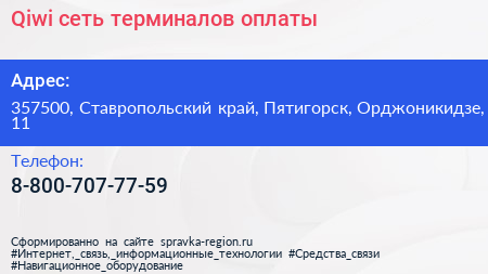 Qiwi, сеть терминалов оплаты по адресу 357500, Ставропольский край, Пятигорск, Орджоникидзе, 11 в дальнейшем Организация, размещена в следующих категориях: