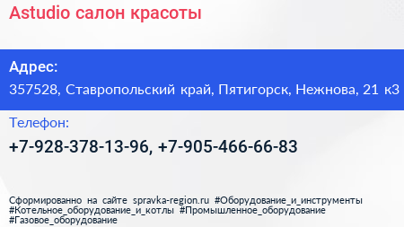 Astudio, салон красоты по адресу 357528, Ставропольский край, Пятигорск, Нежнова, 21 к3 в дальнейшем Организация, размещена в следующих категориях: