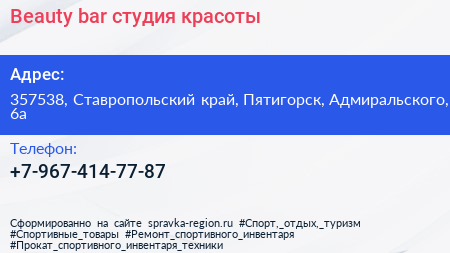Beauty bar, студия красоты по адресу 357538, Ставропольский край, Пятигорск, Адмиральского, 6а в дальнейшем Организация, размещена в следующих категориях: