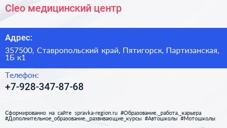 Cleo, медицинский центр по адресу 357500, Ставропольский край, Пятигорск, Партизанская, 1Б к1 в дальнейшем Организация, размещена в следующих категориях: