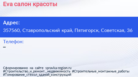 Eva, салон красоты по адресу 357560, Ставропольский край, Пятигорск, Советская, 36 в дальнейшем Организация, размещена в следующих категориях: