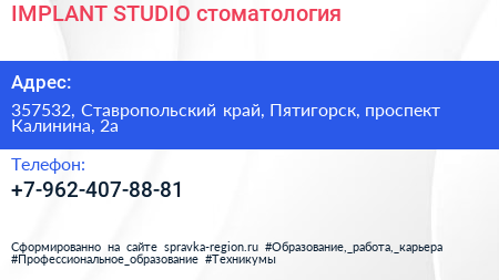 IMPLANT STUDIO, стоматология по адресу 357532, Ставропольский край, Пятигорск, проспект Калинина, 2а в дальнейшем Организация, размещена в следующих категориях: