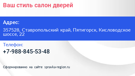 Ваш стиль, салон дверей по адресу 357528, Ставропольский край, Пятигорск, Кисловодское шоссе, 22 в дальнейшем Организация, размещена в следующих категориях: