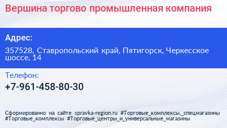 Вершина, торгово-промышленная компания по адресу 357528, Ставропольский край, Пятигорск, Черкесское шоссе, 14 в дальнейшем Организация, размещена в следующих категориях: