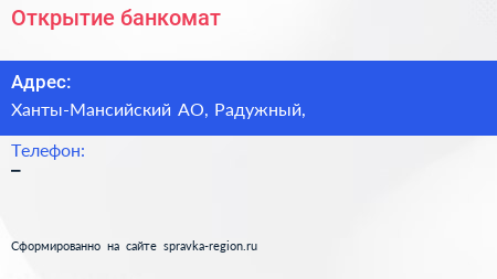 Открытие, банкомат по адресу Ханты-Мансийский АО, Радужный, в дальнейшем Организация, размещена в следующих категориях: