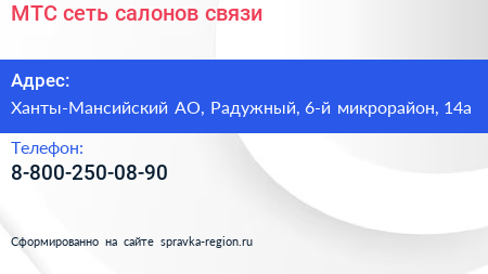 МТС, сеть салонов связи по адресу Ханты-Мансийский АО, Радужный, 6-й микрорайон, 14а в дальнейшем Организация, размещена в следующих категориях: