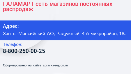 ГАЛАМАРТ, сеть магазинов постоянных распродаж по адресу Ханты-Мансийский АО, Радужный, 4-й микрорайон, 18а в дальнейшем Организация, размещена в следующих категориях: