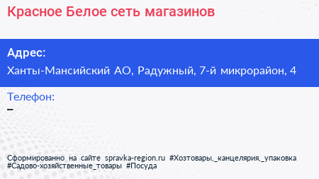 Красное & Белое, сеть магазинов по адресу Ханты-Мансийский АО, Радужный, 7-й микрорайон, 4 в дальнейшем Организация, размещена в следующих категориях: