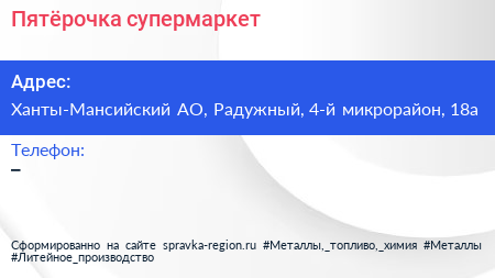 Пятёрочка, супермаркет по адресу Ханты-Мансийский АО, Радужный, 4-й микрорайон, 18а в дальнейшем Организация, размещена в следующих категориях:
