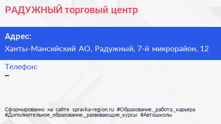 РАДУЖНЫЙ, торговый центр по адресу Ханты-Мансийский АО, Радужный, 7-й микрорайон, 12 в дальнейшем Организация, размещена в следующих категориях: