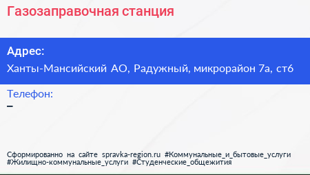 Газозаправочная станция по адресу Ханты-Мансийский АО, Радужный, микрорайон 7а, ст6 в дальнейшем Организация, размещена в следующих категориях: