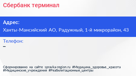 Сбербанк, терминал по адресу Ханты-Мансийский АО, Радужный, 1-й микрорайон, 43 в дальнейшем Организация, размещена в следующих категориях: