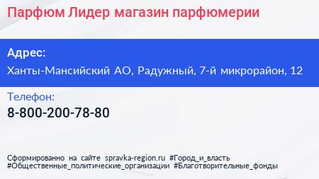 Парфюм-Лидер, магазин парфюмерии по адресу Ханты-Мансийский АО, Радужный, 7-й микрорайон, 12 в дальнейшем Организация, размещена в следующих категориях: