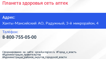 Планета здоровья, сеть аптек по адресу Ханты-Мансийский АО, Радужный, 3-й микрорайон, 4 в дальнейшем Организация, размещена в следующих категориях: