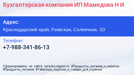 Бухгалтерская компания, ИП Мамедова Н.И. по адресу Краснодарский край, Раевская, Солнечная, 10 в дальнейшем Организация, размещена в следующих категориях: