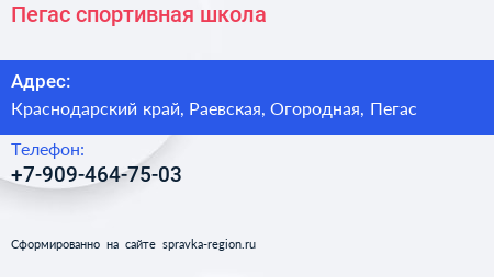 Пегас, спортивная школа по адресу Краснодарский край, Раевская, Огородная, Пегас в дальнейшем Организация, размещена в следующих категориях: