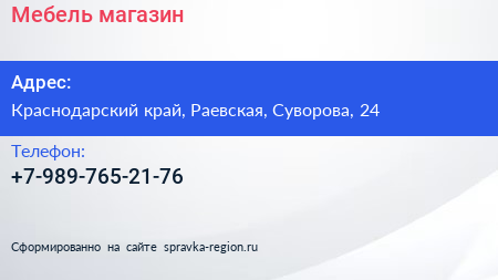 Мебель, магазин по адресу Краснодарский край, Раевская, Суворова, 24 в дальнейшем Организация, размещена в следующих категориях: