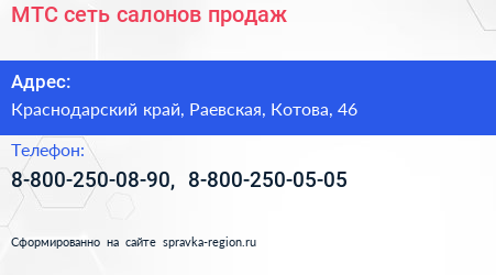 МТС, сеть салонов продаж по адресу Краснодарский край, Раевская, Котова, 46 в дальнейшем Организация, размещена в следующих категориях: