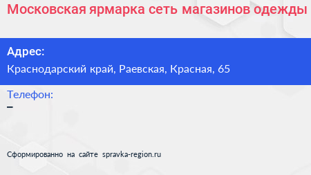 Московская ярмарка, сеть магазинов одежды по адресу Краснодарский край, Раевская, Красная, 65 в дальнейшем Организация, размещена в следующих категориях: