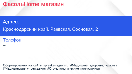 ФасольHome, магазин по адресу Краснодарский край, Раевская, Сосновая, 2 в дальнейшем Организация, размещена в следующих категориях: