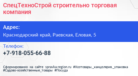 СпецТехноСтрой, строительно-торговая компания по адресу Краснодарский край, Раевская, Еловая, 5 в дальнейшем Организация, размещена в следующих категориях: