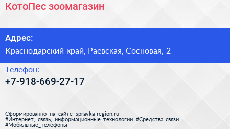 КотоПес, зоомагазин по адресу Краснодарский край, Раевская, Сосновая, 2 в дальнейшем Организация, размещена в следующих категориях: