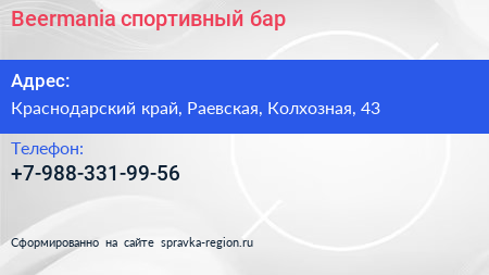 Beermania, спортивный бар по адресу Краснодарский край, Раевская, Колхозная, 43 в дальнейшем Организация, размещена в следующих категориях:
