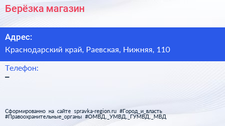 Берёзка, магазин по адресу Краснодарский край, Раевская, Нижняя, 110 в дальнейшем Организация, размещена в следующих категориях: