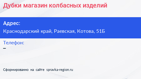 Дубки, магазин колбасных изделий по адресу Краснодарский край, Раевская, Котова, 51Б в дальнейшем Организация, размещена в следующих категориях: